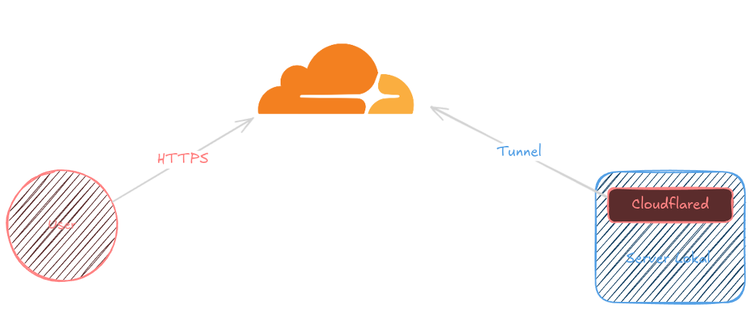 Alternatif kedua terdengar lebih "magic" . Namanya adalah tunneling - sebuah cara untuk mengekspose aplikasi lokal ke publik tanpa perlu IP publik. Terlihat magic bukan? Gimana sih cara kerjanya? Sederhananya, tunneling itu seperti membuat terowongan khusus dari server lokal ke server publik. Sehingga jika ada trafik yang masuk ke server lokal maka akan lewat server publik, lalu ke terowongan tadi, terus baru sampe ke server lokal. Untuk melakukan tunneling ada beberapa cara seperti menggunakan Cloudflare Tunnel atau Ngrok.